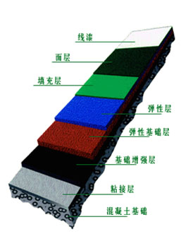 塑材軟墊及丙烯酸涂面系統(tǒng),其厚度約為3-4mm。內(nèi)含百分百無機性纖維顏料,鋪設(shè)在已沖洗干凈值良好及排水斜度(1:100至1:150之內(nèi))的水泥或瀝青地面基礎(chǔ)上。